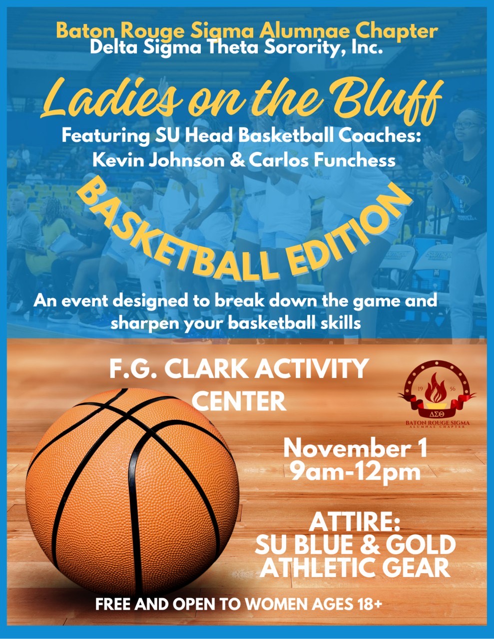 Join Southern University Coaches Kevin Johnson and Carlos Funchess along with the men’s and women’s teams on Saturday, November 1, 2025 at 9:00 am at the FG Clark Activity Center (sponsored by Baton Rouge Sigma Alumnae Chapter, Delta Sigma Theta Sorority, Inc).