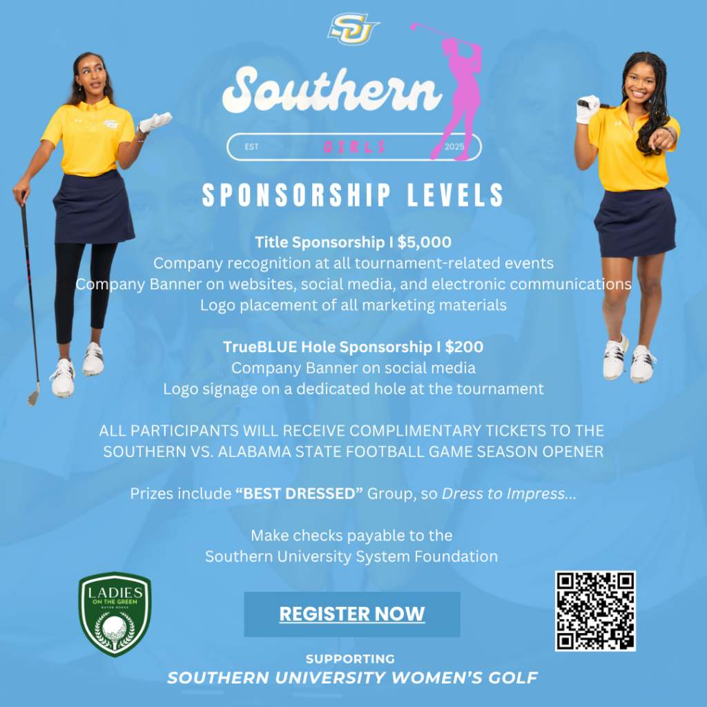This 9-hole tournament brings together the Jaguar Nation to support Southern University’s athletic programs, with special emphasis on women’s sports. Your participation directly funds scholarships, equipment, and opportunities for the next generation of female student-athletes.