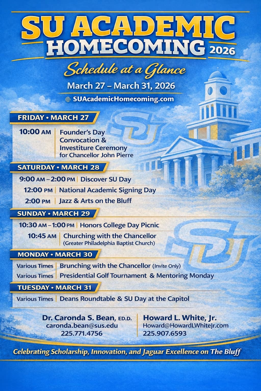 Join us for the 2nd Annual SU Academic Homecoming 2026, a landmark event convened by Chancellor John Pierre dedicated to celebrating our rich legacy and building a brighter future for Southern University. As we build on this new tradition, we invite alumni, corporate partners, and community leaders to connect, collaborate, and celebrate the tremendous achievements of our Southern University family.